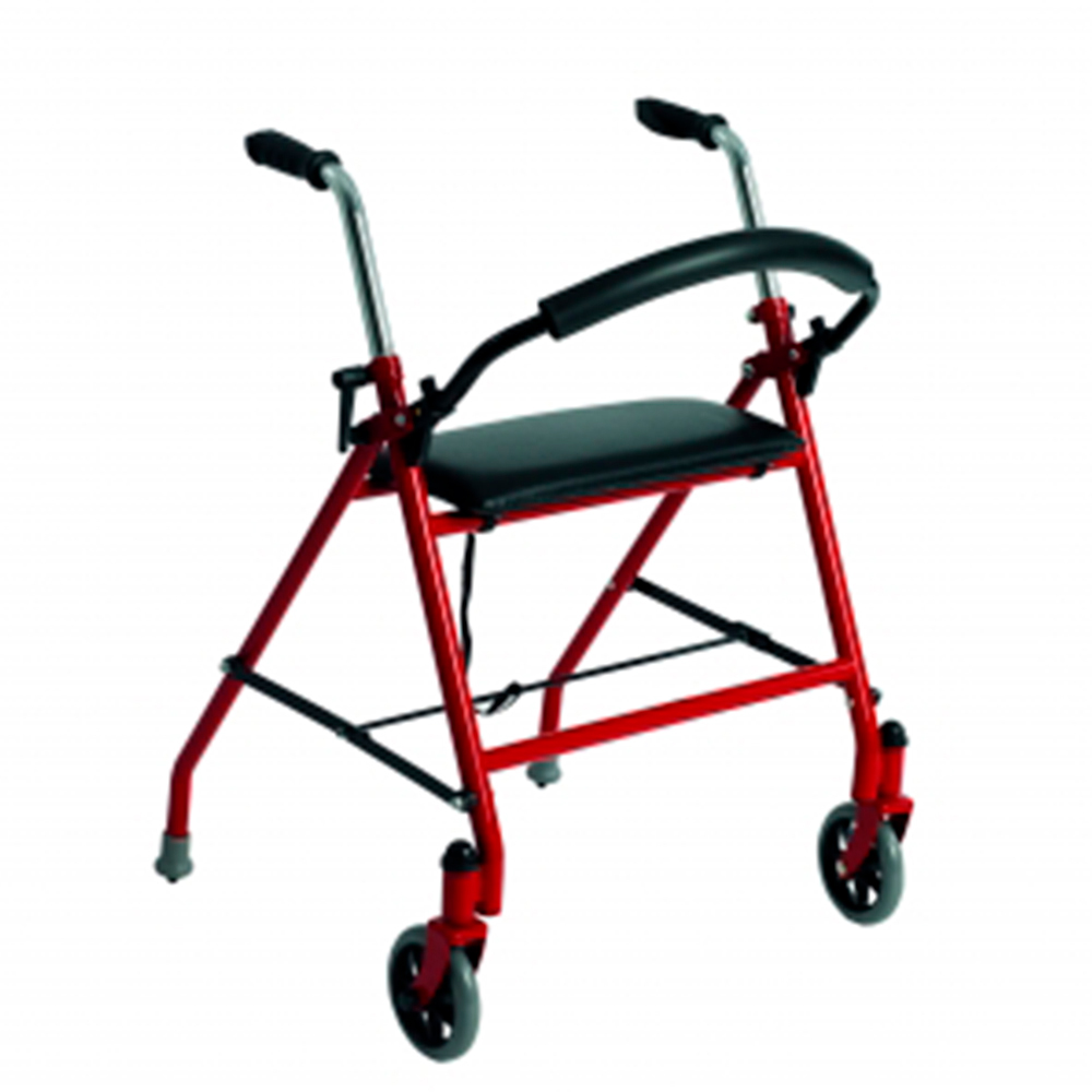 Andador con asiento y 4 ruedas.